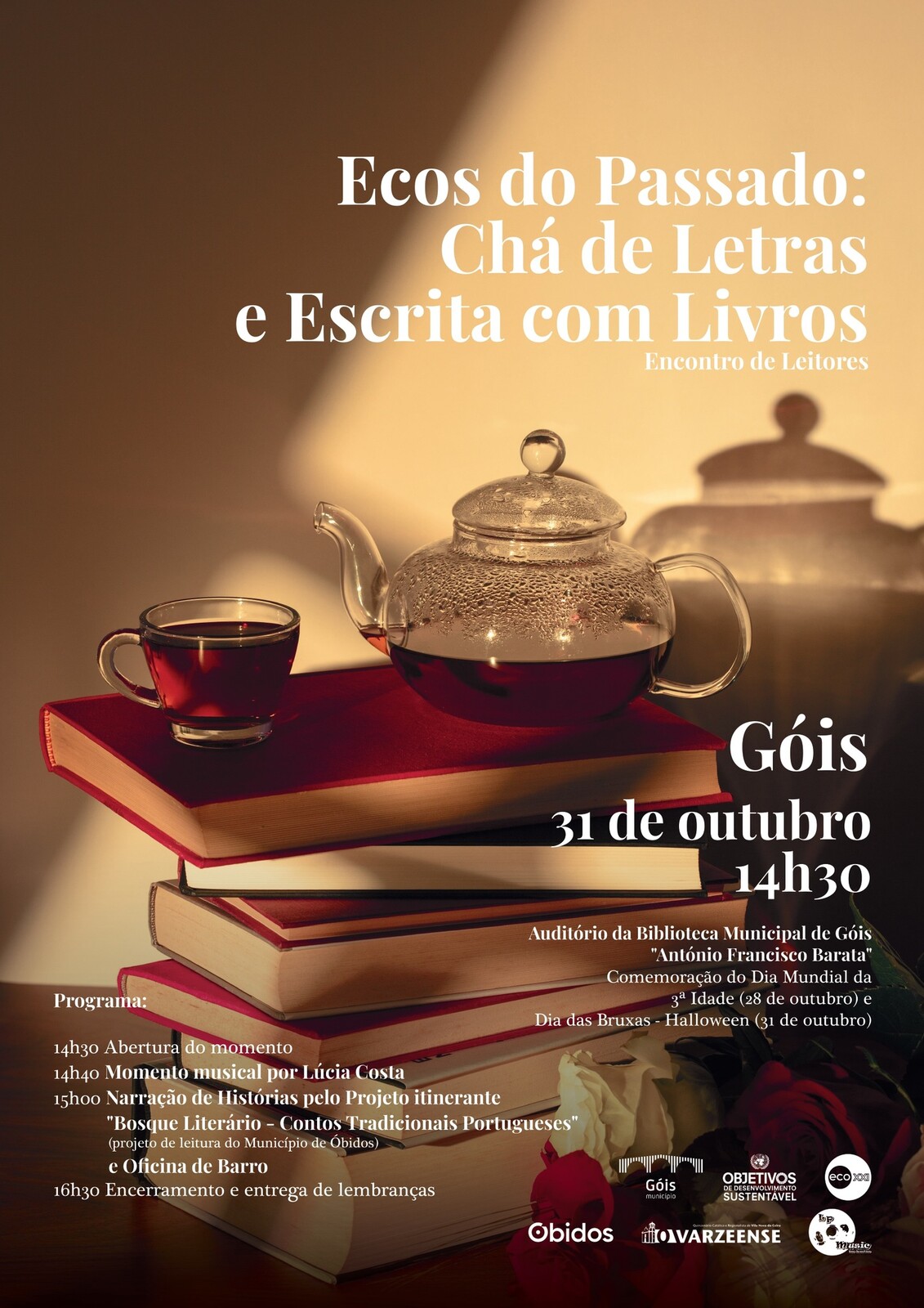 O Município de Góis, no âmbito da comemoração do Dia Mundial da 3ª Idade (28 de outubro) e do Dia das Bruxas - Halloween (31 de outubro), irá promover a iniciativa “Chá de Letras e Escrita com Livros | Encontro de Leitores”, no dia 31 de outubro, pelas 14h30, no Auditório da Biblioteca Municipal de Góis António Francisco Barata, destinada ao público sénior institucionalizado (IPSS).