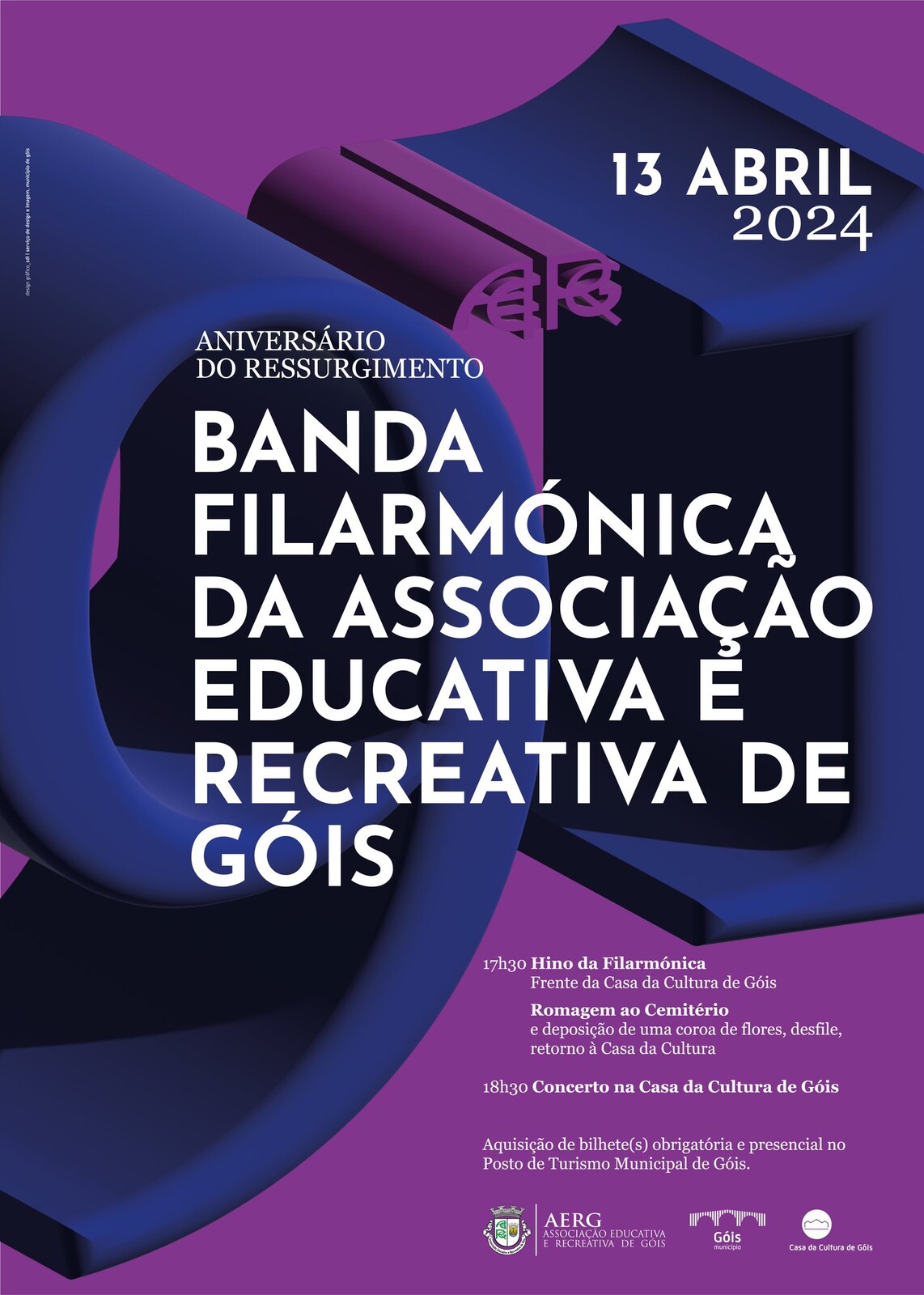 O Município de Góis divulga o Concerto Comemorativo do 91º Aniversário do Ressurgimento da Banda Filarmónica AERG, promovido pela Associação Educativa e Recreativa de Góis, que irá realizar-se no próximo dia 13 de Abril, com início pelas 17h30, na Casa da Cultura de Góis, com a seguinte programação: