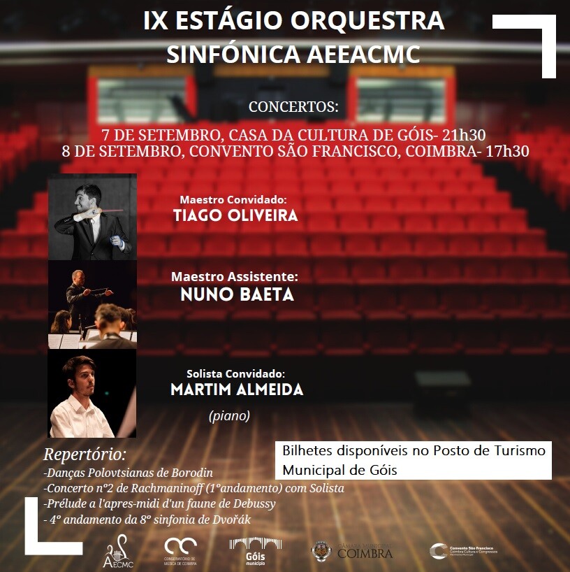 O Município de Góis irá acolher o concerto da Orquestra Sinfónica AEEACMC - Associação de Estudantes do Conservatório de Música de Coimbra, no dia 7 de setembro, pelas 21h30, no auditório da Casa da Cultura de Góis, no âmbito do IX Estágio de Orquestra Sinfónica AEEACMC, que irá decorrer em Góis, de 1 a 8 de setembro, e que conta com uma programação diversificada, desde ensaios, atividades lúdicas, convidados especiais, concertos, e muito mais.