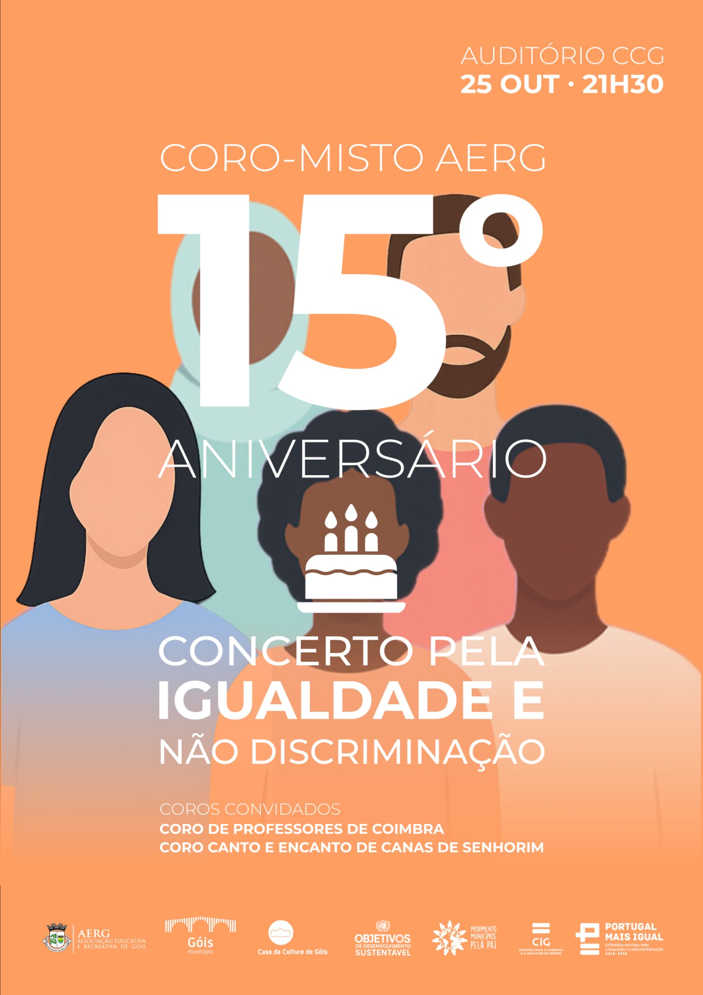 No âmbito do Mês da Igualdade, o Município de Góis divulga o Concerto pela Igualdade e Não-Discriminação - 15º Aniversário do Coro-Misto da AERG, promovido pela Associação Educativa e Recreativa de Góis, que irá realizar-se no próximo dia 25 de Outubro, pelas 21h30, no Auditório da Casa da Cultura de Góis, com a participação do Coro de Professores de Coimbra e do Coro Canto e Encanto de Canas de Senhorim.