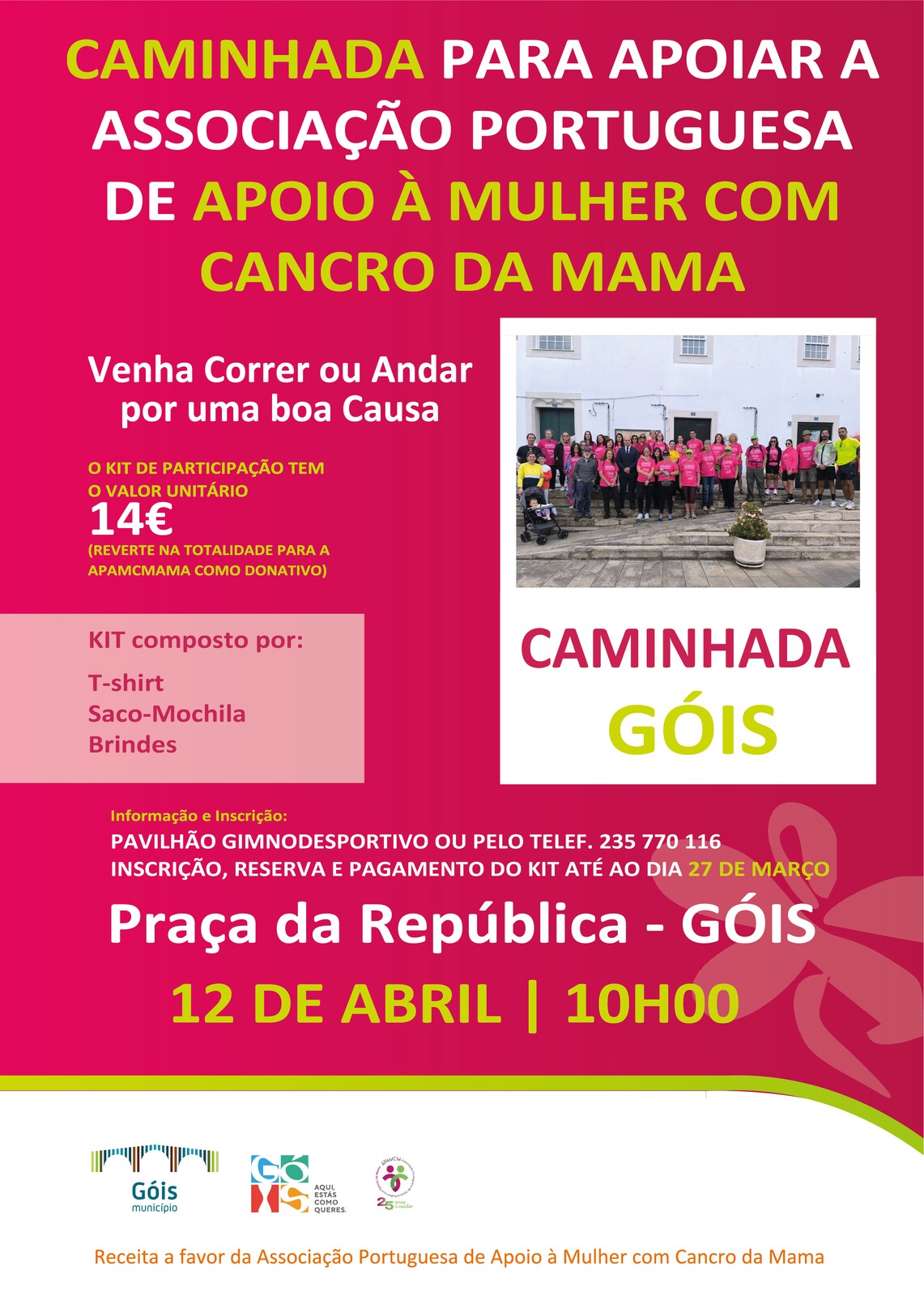 O Município de Góis volta a associar-se à campanha nacional “Corrida Sempre Mulher”, dedicada à prevenção do cancro da mama, promovendo uma caminhada solidária na Vila de Góis. A iniciativa tem como objetivo angariar fundos para a Associação Portuguesa de Apoio à Mulher com Cancro da Mama (APAMCM).