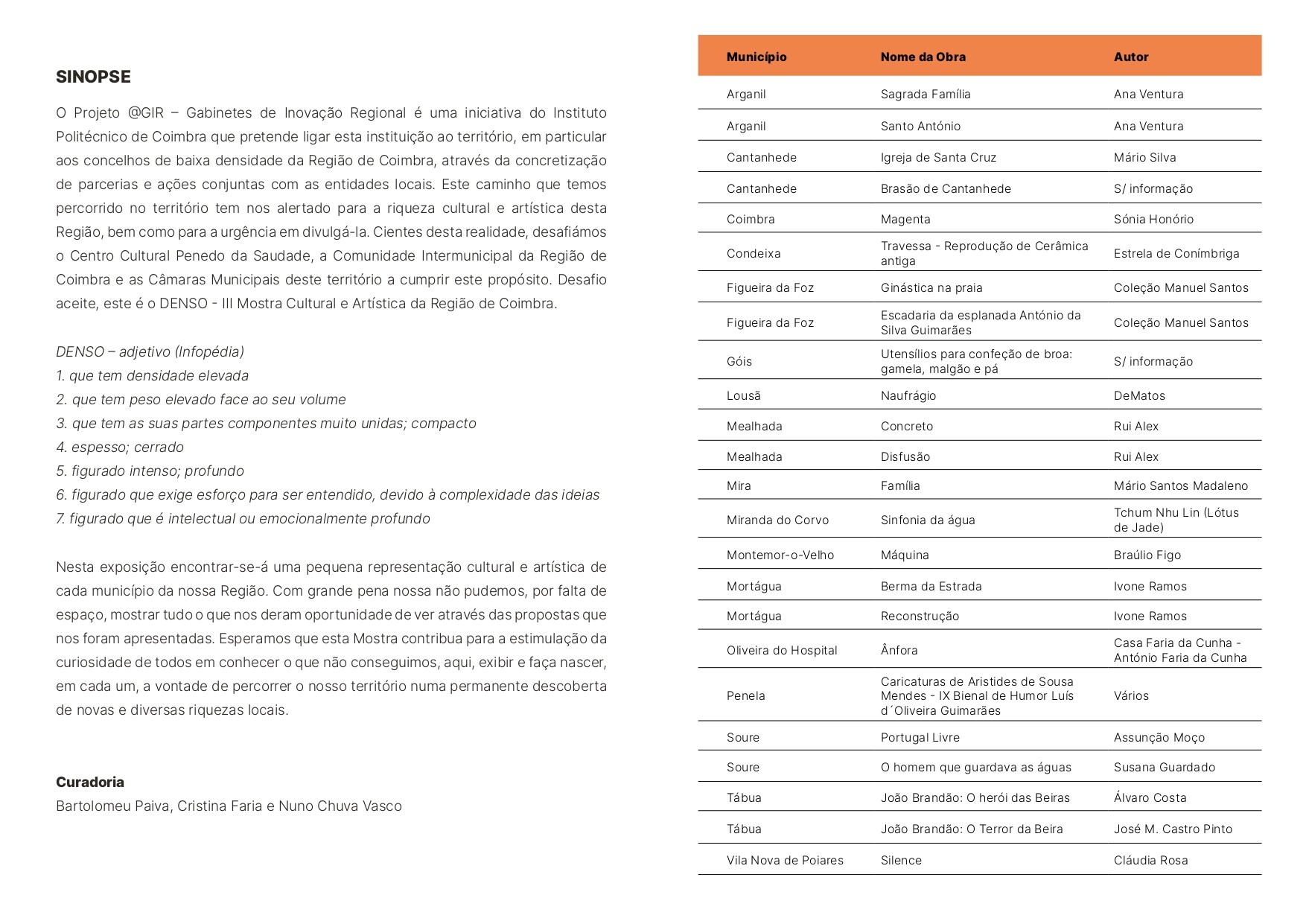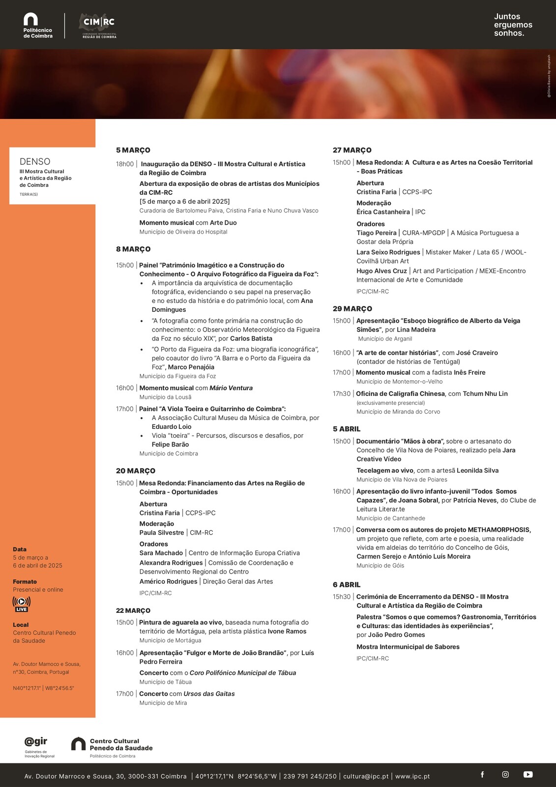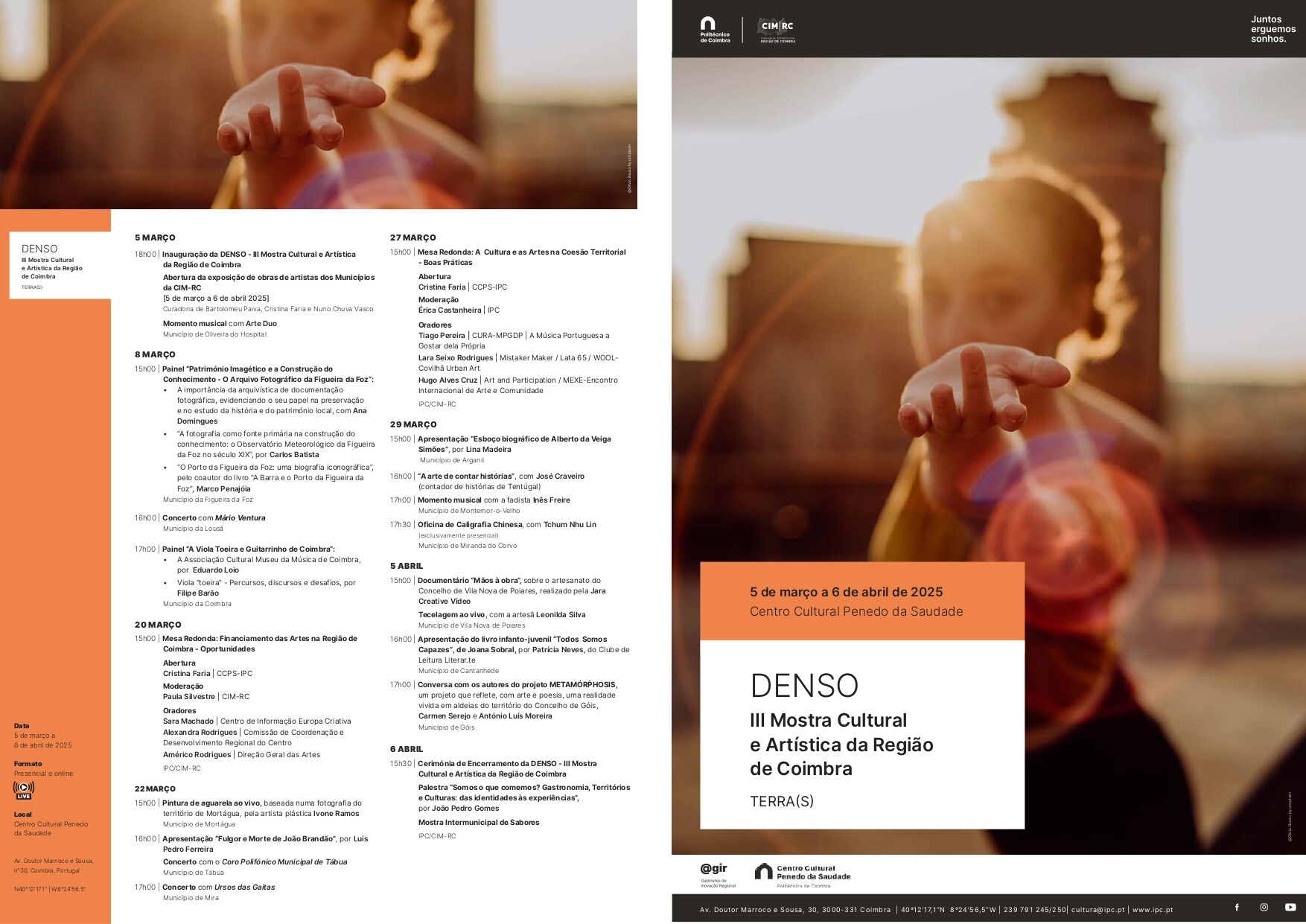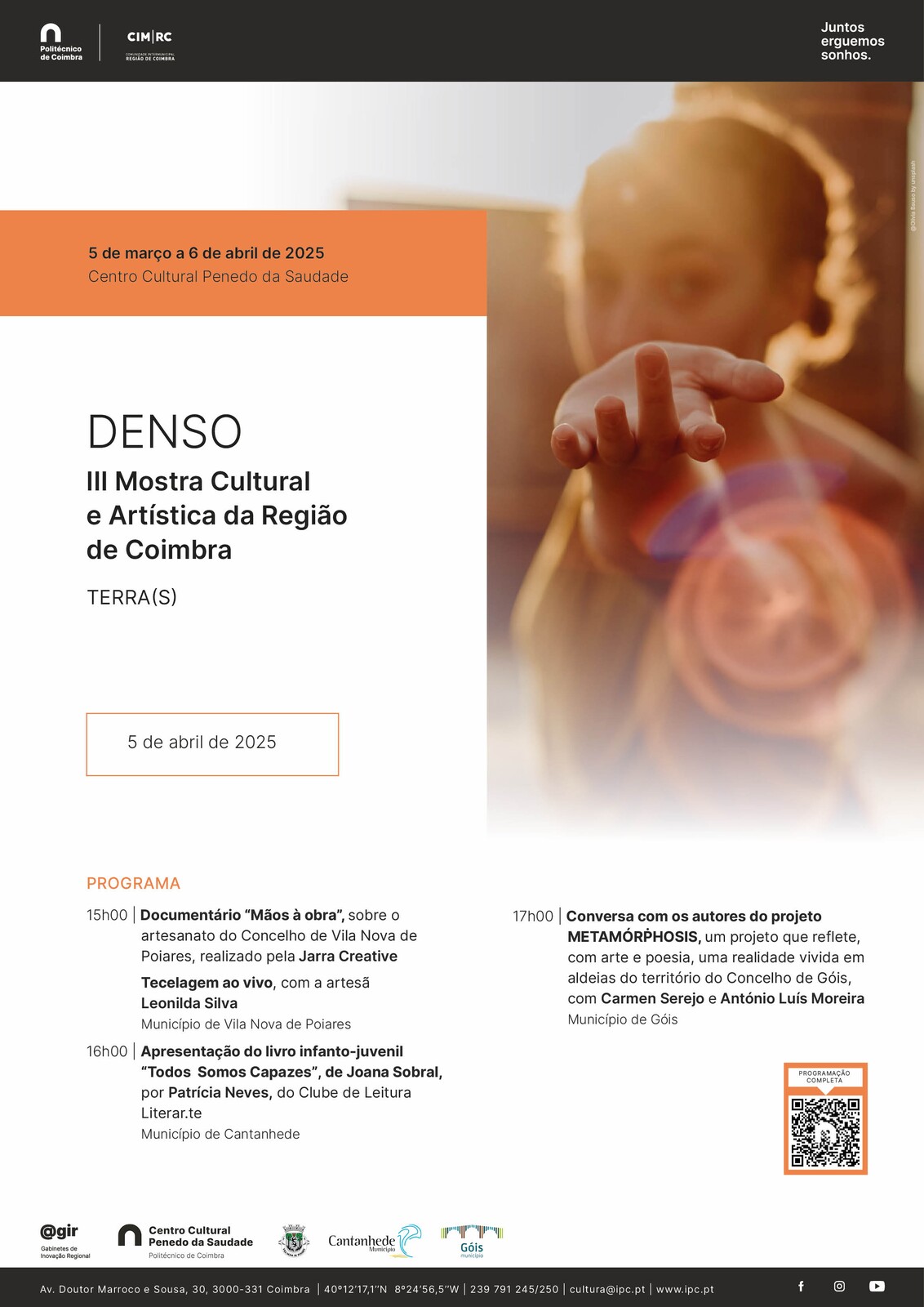 O Município de Góis participa em mais uma edição da DENSO, este ano, a 3ª Mostra Cultural e Artística da Região de Coimbra, promovida pela Comunidade Intermunicipal da Região de Coimbra, em parceria com o Instituto Politécnico de Coimbra e os 19 Municípios, que vai decorrer de 𝟓 𝐝𝐞 𝐦𝐚𝐫ç𝐨 𝐚 𝟔 𝐝𝐞 𝐚𝐛𝐫𝐢𝐥, no Centro Cultural Penedo da Saudade, em Coimbra.