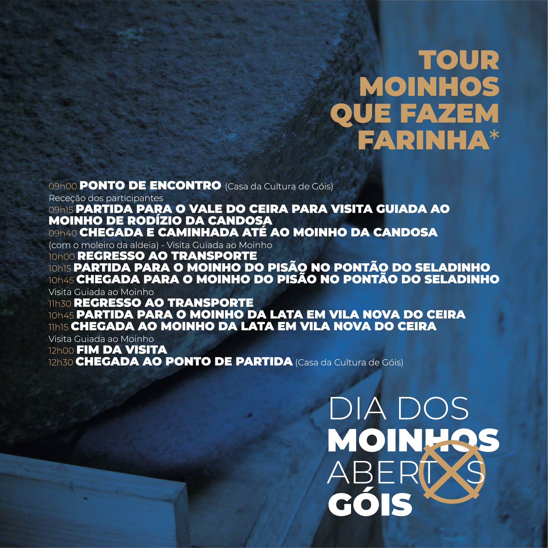 No âmbito do Dia Nacional dos Moinhos Abertos, o Município de Góis promove a Tour “Moinhos que fazem farinha”, no dia 07 de Abril, em parceria com a Rede Portuguesa de Moinhos.