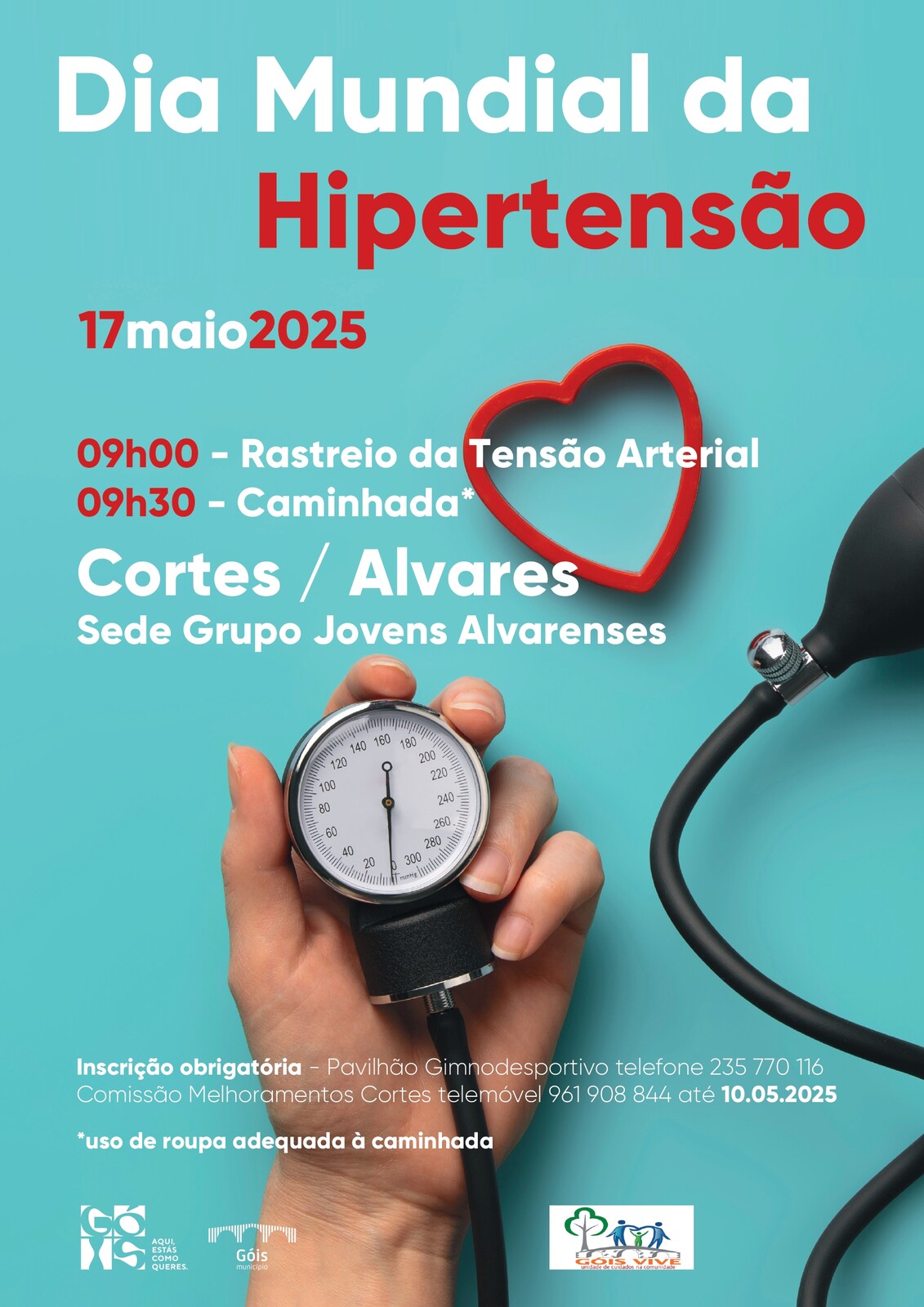 Neste sentido, o Município de Góis irá realizar um rastreio da tensão arterial, com a colaboração da Unidade de Cuidados na Comunidade Góis Vive e da enfermeira Ana Barata, na qual irão informar e sensibilizar a população sobre as doenças cardiovasculares, pelas 09h00, na Sede Grupo Jovens Alvarenses, em Cortes, na Freguesia de Alvares.