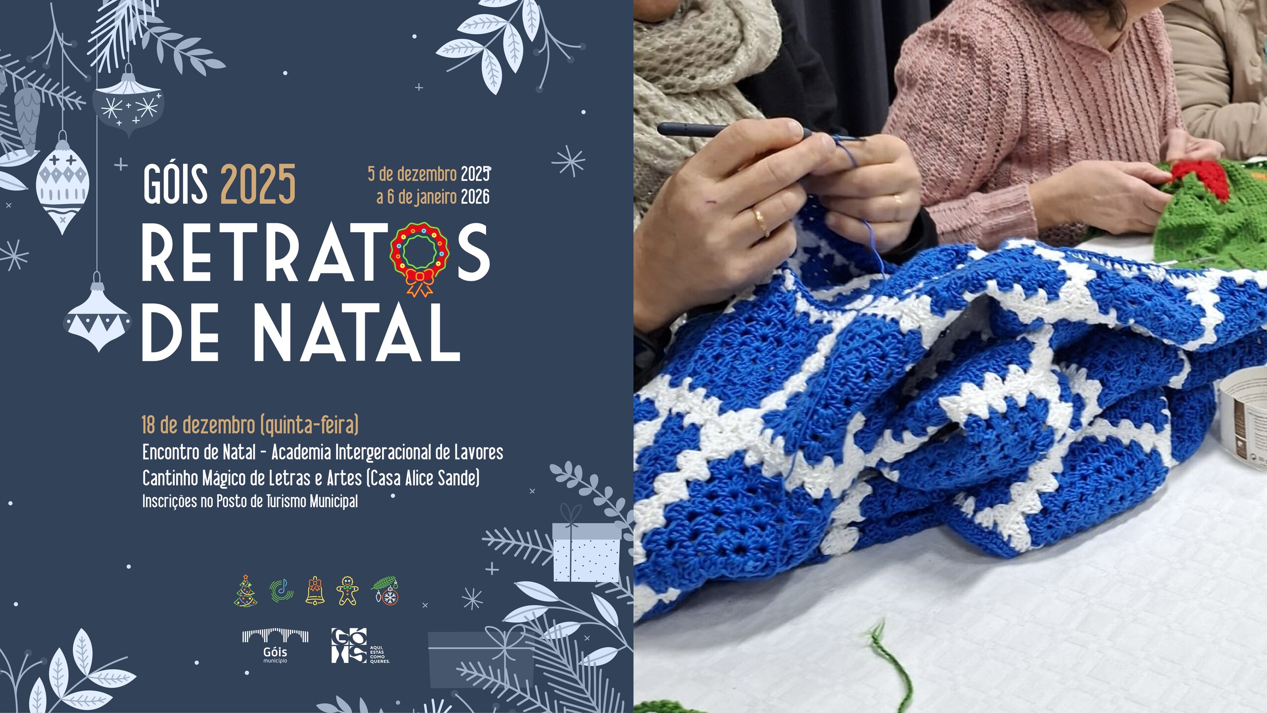 No próximo dia 𝟏𝟖 𝐝𝐞 𝐝𝐞𝐳𝐞𝐦𝐛𝐫𝐨, entre as 𝟏𝟒𝐡𝟑𝟎 𝐞 𝐚𝐬 𝟏𝟔𝐡𝟑𝟎, o Município de Góis promove um Encontro de Natal - Academia Intergeracional de Lavores, no 𝐂𝐚𝐧𝐭𝐢𝐧𝐡𝐨 𝐌𝐚́𝐠𝐢𝐜𝐨 𝐝𝐞 𝐋𝐞𝐭𝐫𝐚𝐬 𝐞 𝐀𝐫𝐭𝐞𝐬 (𝐂𝐚𝐬𝐚 𝐀𝐥𝐢𝐜𝐞 𝐒𝐚𝐧𝐝𝐞).