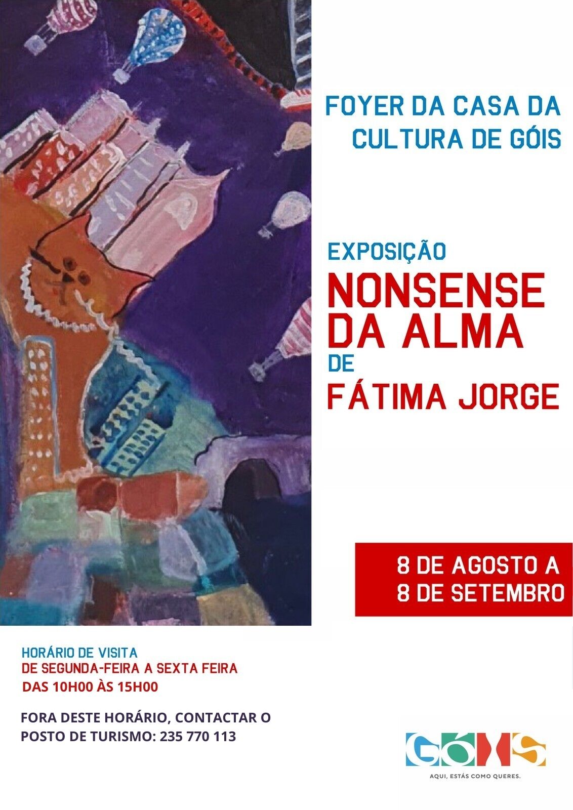O Município de Góis vai acolher a exposição "NONSENSE DA ALMA", da artista plástica Fátima Jorge, a qual estará patente ao público, com entrada gratuita, de 𝟖 𝐝𝐞 𝐚𝐠𝐨𝐬𝐭𝐨 𝐚 𝟖 𝐝𝐞 𝐬𝐞𝐭𝐞𝐦𝐛𝐫𝐨, no 𝐅𝐨𝐲𝐞𝐫 𝐝𝐚 𝐂𝐚𝐬𝐚 𝐝𝐚 𝐂𝐮𝐥𝐭𝐮𝐫𝐚 𝐝𝐞 𝐆ó𝐢𝐬.