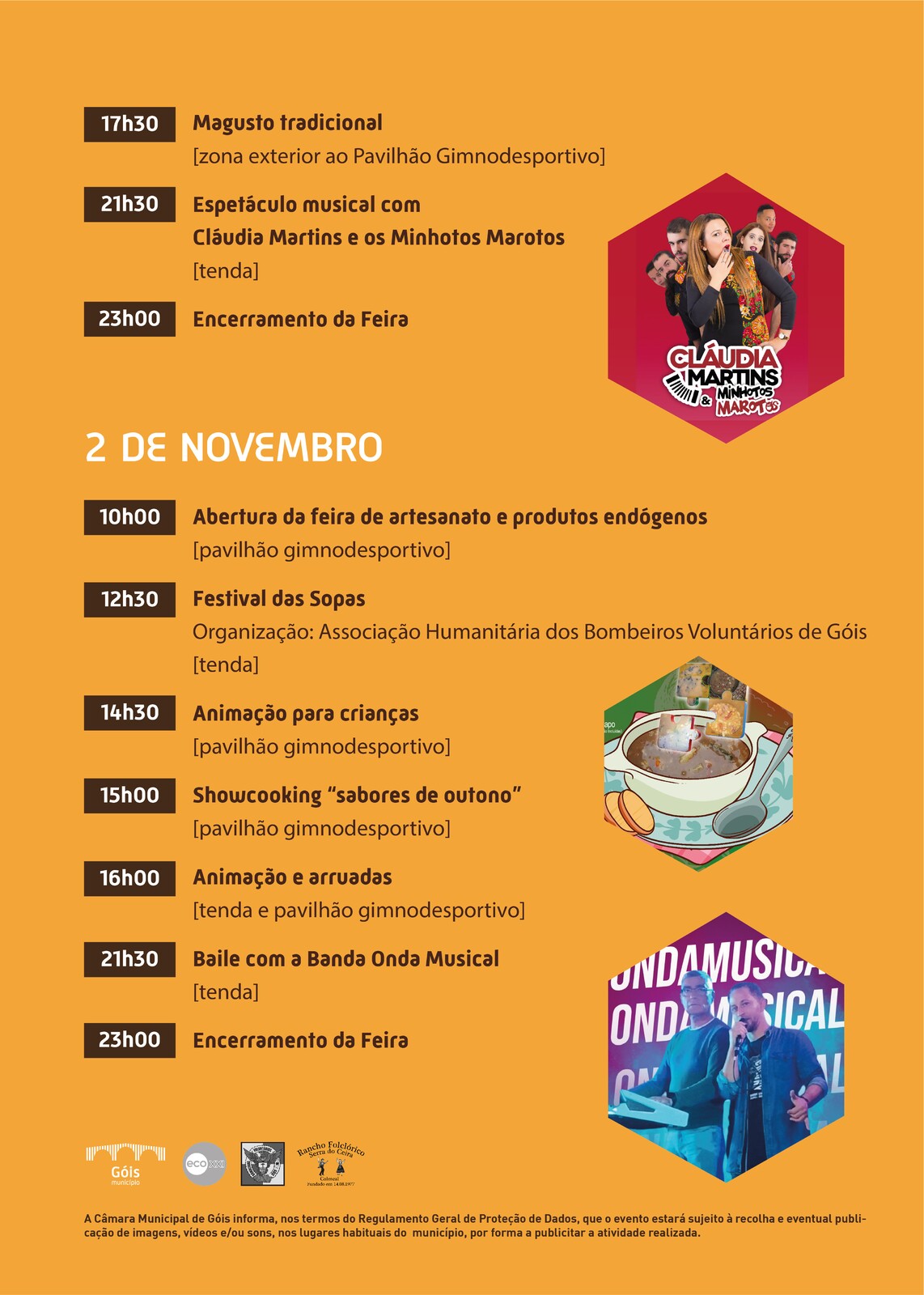 Desde tasquinhas, produtos artesanais, animação infantil, showcooking, música, e muito mais… a autarquia convida-o/a a desfrutar de um fim de semana animado, com entrada gratuita no Pavilhão Gimnodesportivo de Góis e Tenda adjacente, e a participar no XXI Torneio da Malha Inter-Coletividades, no Tradicional Magusto e a associar-se ao Festival das Sopas, promovido pelos Bombeiros Voluntários de Góis (aquisição de kit obrigatório).