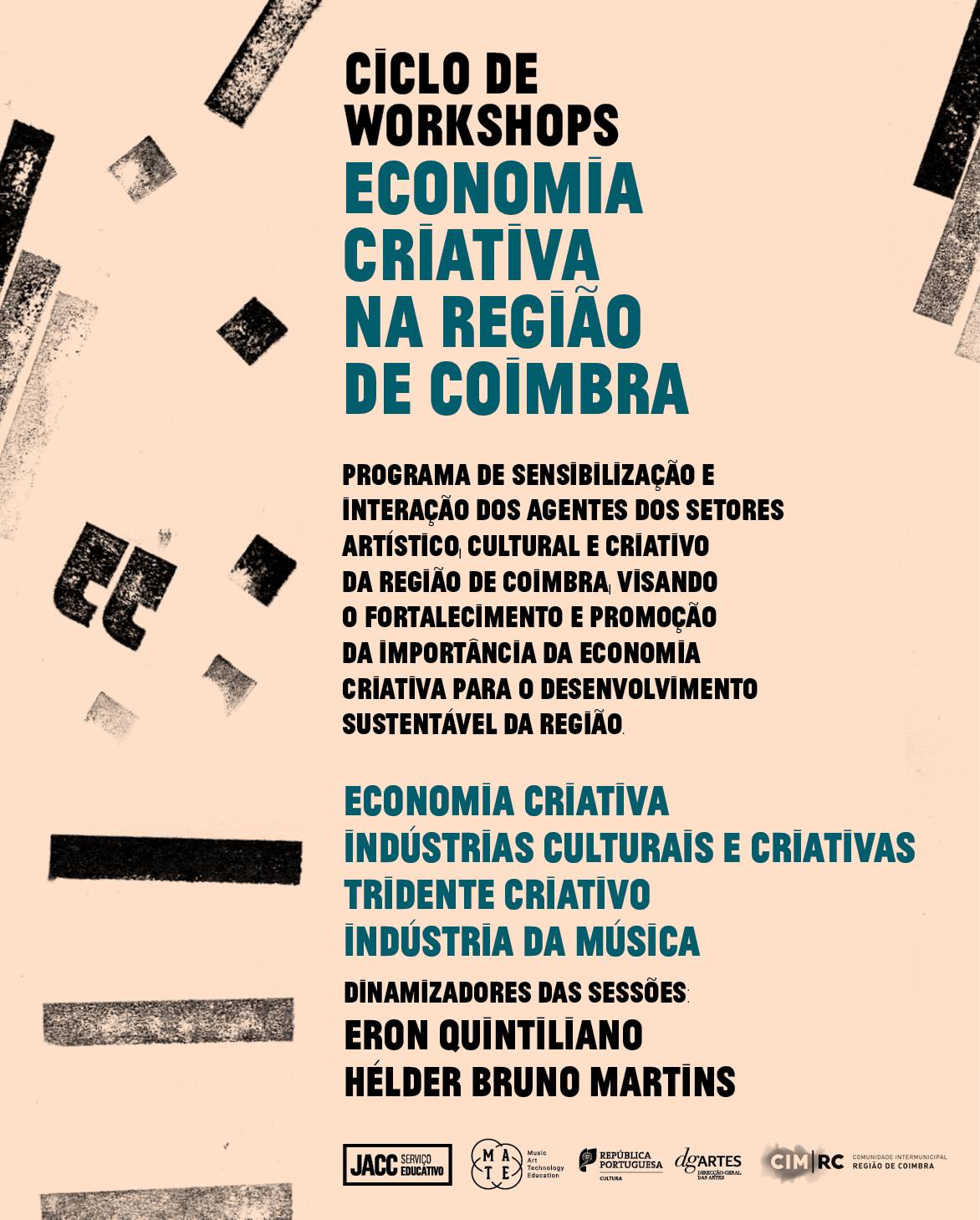 O JACC - Jazz ao Centro Clube e o MATE, em parceria com a CIM Região de Coimbra, vão percorrer a região com o "Ciclo de Workshops - Economia Criativa na Região de Coimbra", um programa de sensibilização e interação dos agentes dos setores artístico, cultural e criativo da região de Coimbra, visando o fortalecimento e promoção da importância da Economia Criativa para o desenvolvimento sustentável desta região.
