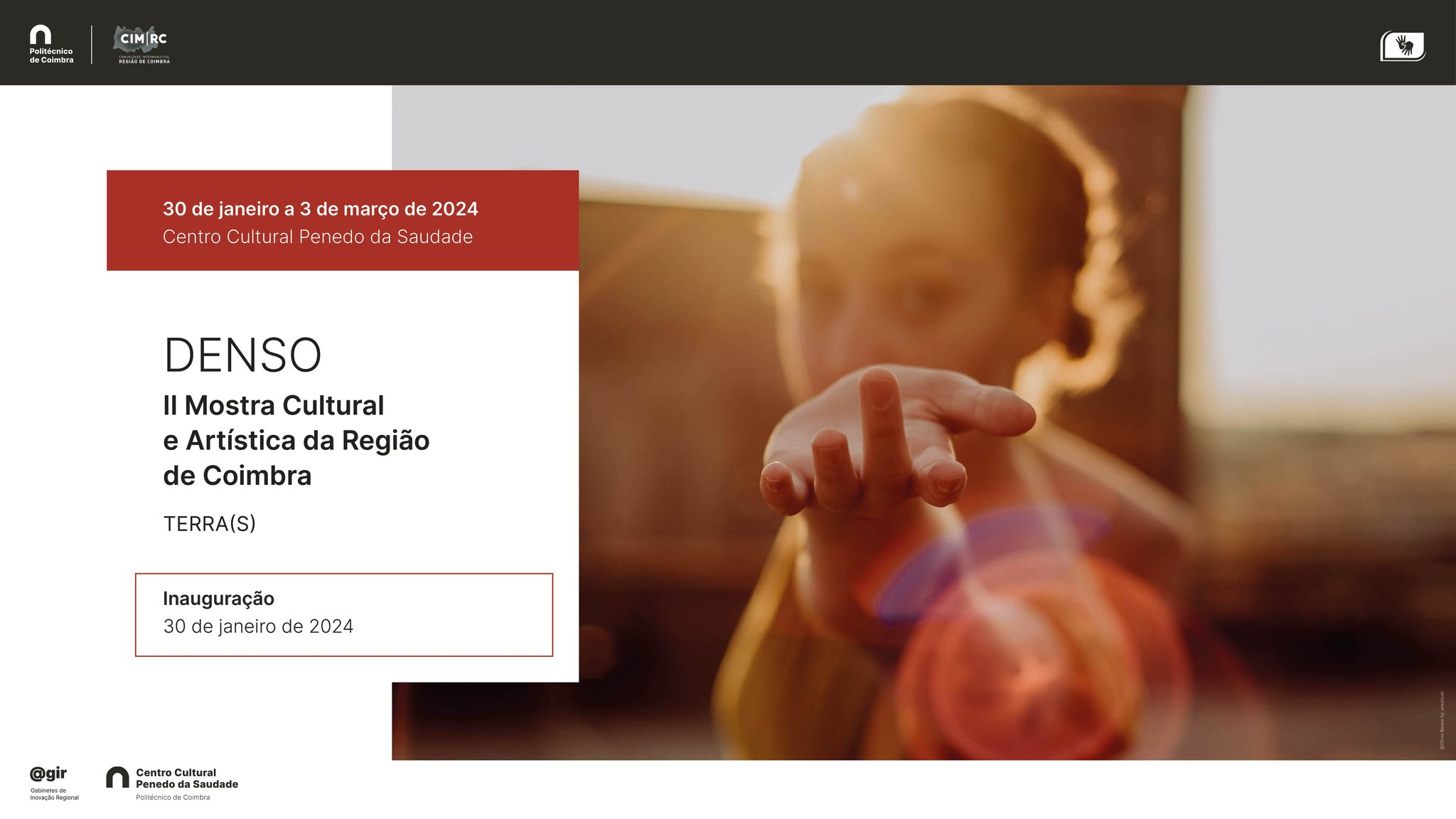O Instituto Politécnico de Coimbra, a CIM Região de Coimbra e os 19 Municípios que a integram promovem a DENSO - II Mostra Cultural e Artística da Região de Coimbra, entre 30 de janeiro e 3 de março, no Centro Cultural Penedo da Saudade.
