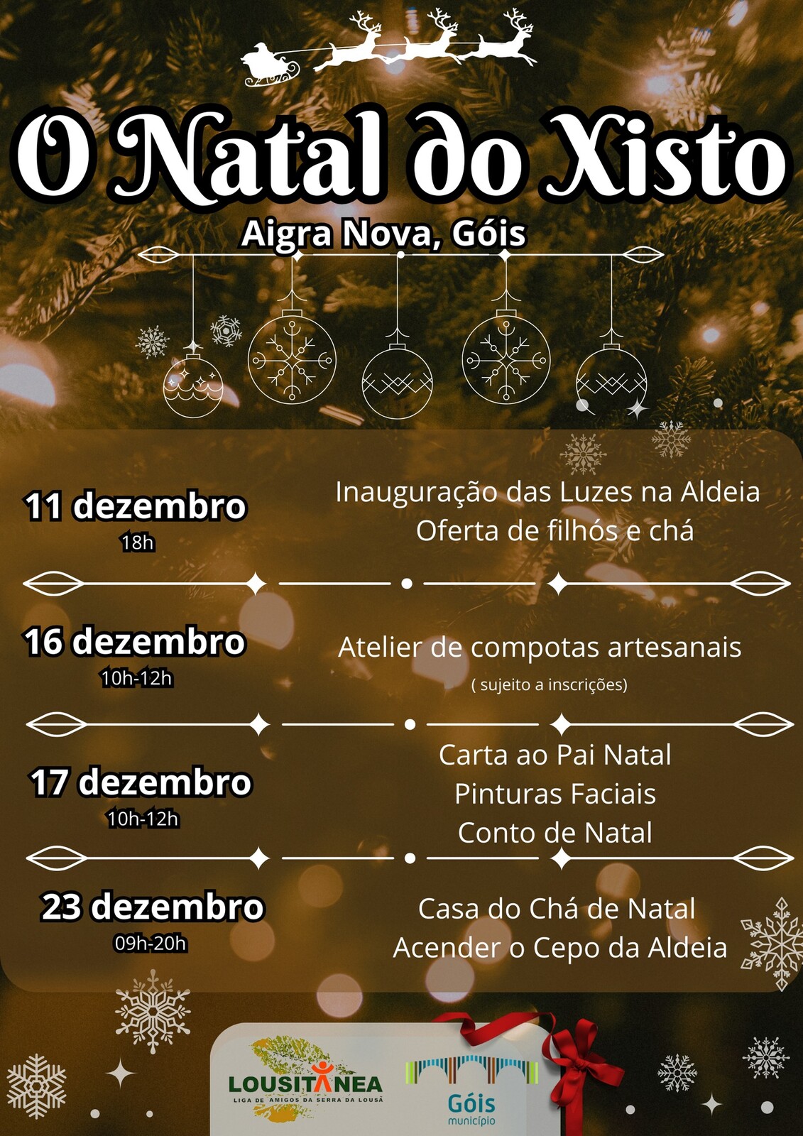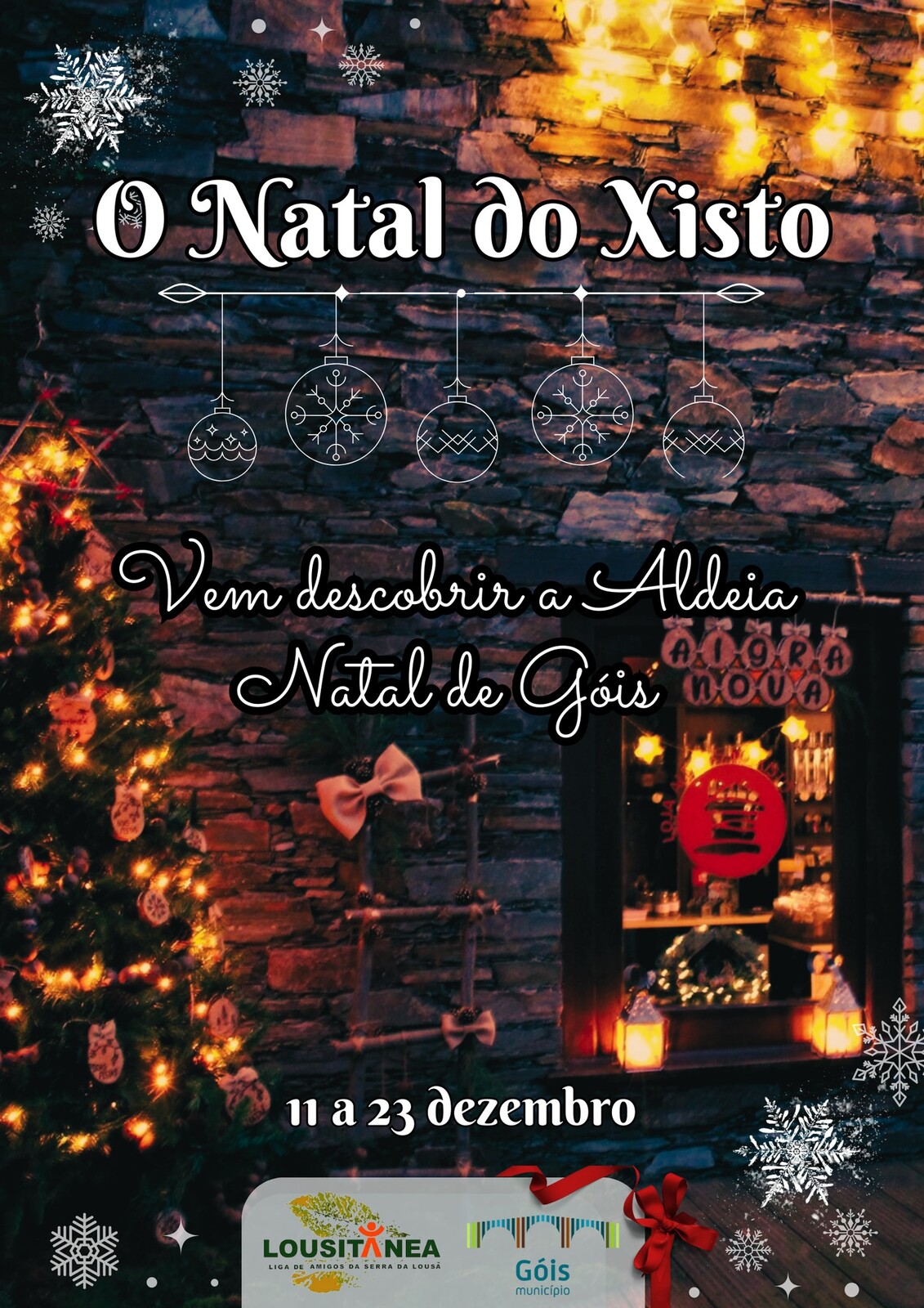 De 11 a 23 de dezembro, a Lousitânea pretende criar um momento de partilha natalícia na aldeia, podendo decorar as ruas da aldeia e dinamizar atividades associadas à quadra, como escrever a carta ao Pai Natal e/ou tirar fotos temáticas, oficinas de doces tradicionais e criação de presépios. Não faltarão motivos para celebrar o Natal nesta Aldeia do Xisto.