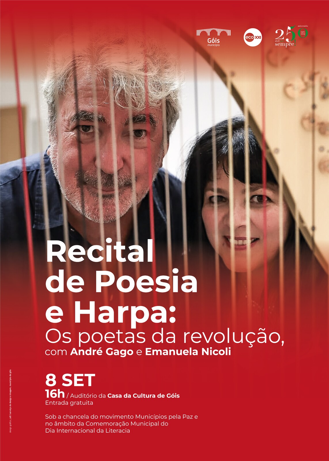 No âmbito da Comemoração Municipal do Dia Internacional da Literacia, do Aniversário dos 50 anos do 25 de Abril e sob a chancela do movimento Municípios pela Paz, o Município de Góis apresenta o Recital de Poesia e Harpa: Os Poetas da Revolução, com André Gago e Emanuela Nicoli, no dia 8 de setembro, pelas 16h00, no Auditório da Casa da Cultura de Góis.
