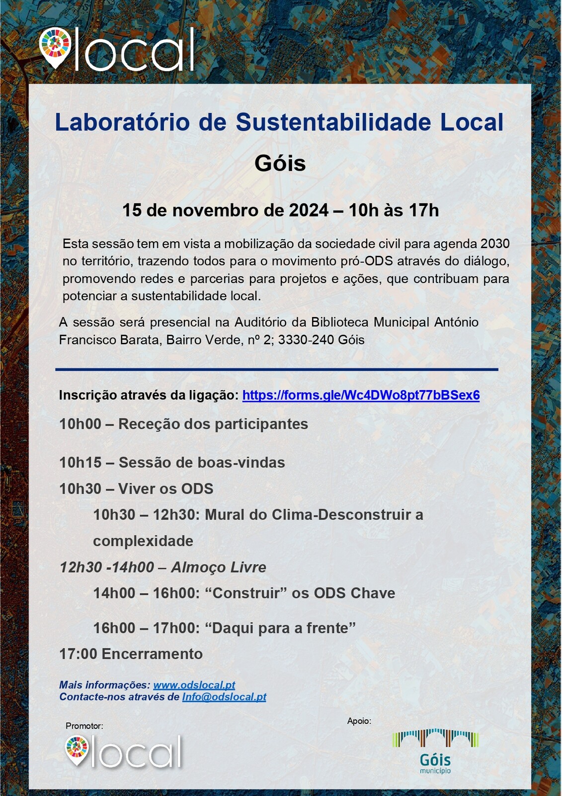 O Município de Góis irá acolher, no dia 15 de novembro, uma sessão intitulada “Laboratório de Sustentabilidade Local”, das 10h00 às 17h00, no Auditório da Biblioteca Municipal António Francisco Barata, promovida pela ODS Local.
