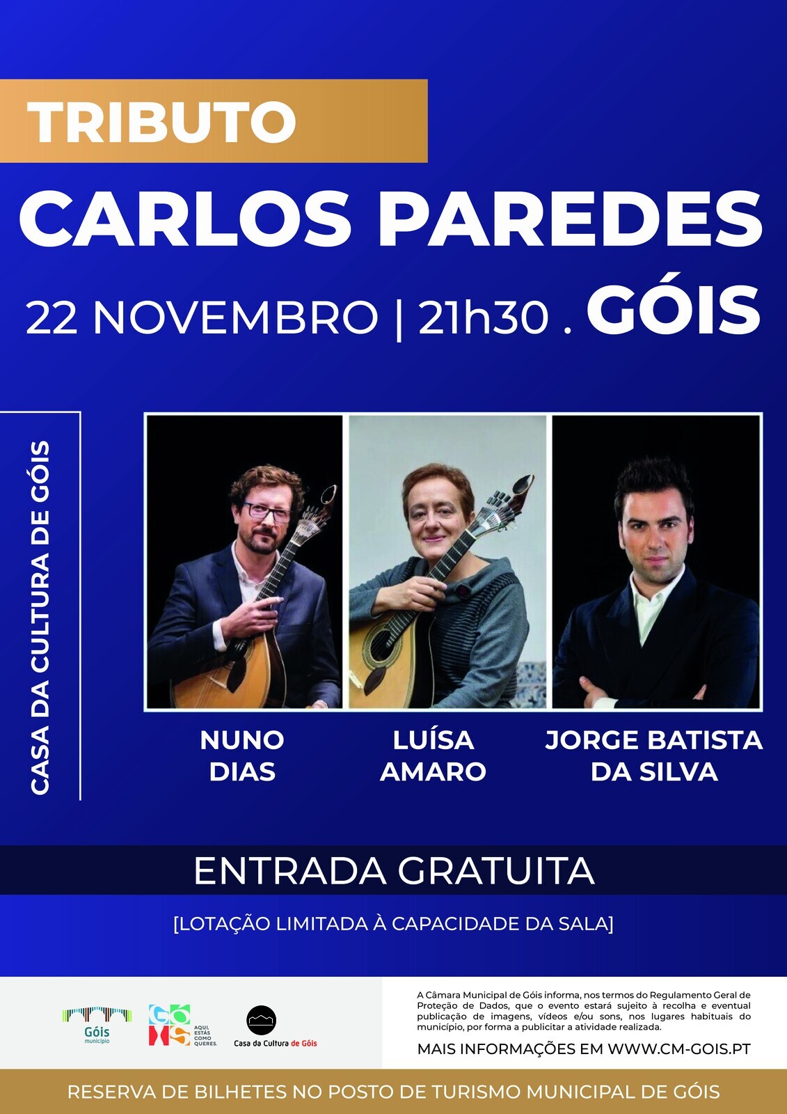 O Município de Góis apresenta o concerto “Tributo a Carlos Paredes”, por Nuno Dias, Luísa Amaro e Jorge Batista da Silva e com produção de Filipa Lopes Espetáculos, no dia 𝟐𝟐 𝐝𝐞 𝐧𝐨𝐯𝐞𝐦𝐛𝐫𝐨, pelas 𝟐𝟏𝐡𝟑𝟎, no 𝐀𝐮𝐝𝐢𝐭𝐨́𝐫𝐢𝐨 𝐝𝐚 𝐂𝐚𝐬𝐚 𝐝𝐚 𝐂𝐮𝐥𝐭𝐮𝐫𝐚 𝐝𝐞 𝐆𝐨́𝐢𝐬.