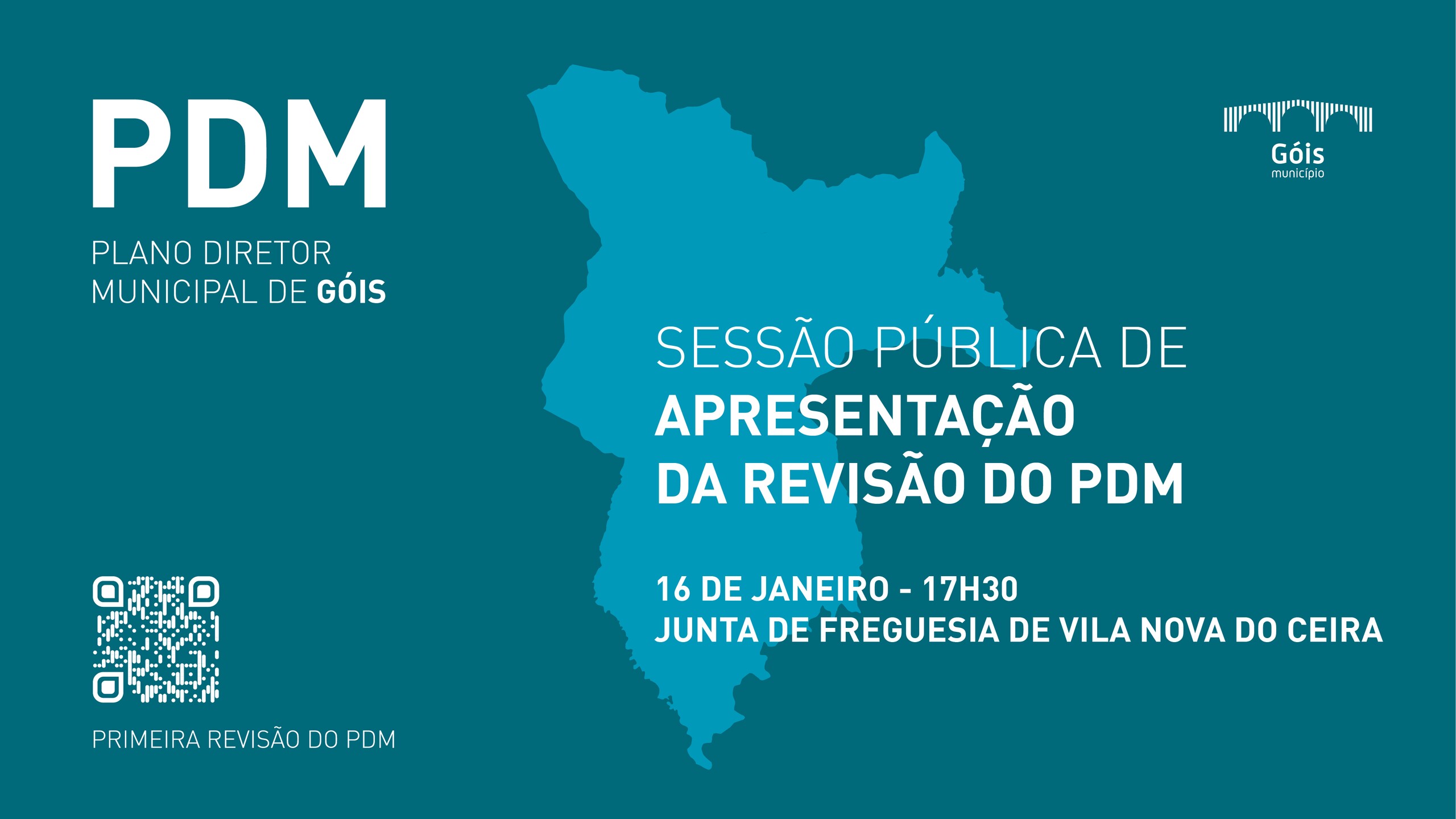 O PDM é um plano que estabelece a estratégia de desenvolvimento e as regras para utilização, ocupação e transformação do uso do solo em todo o Concelho. Neste sentido, o Município de Góis convida toda a população a participar na Sessão Pública de Apresentação e Discussão da Revisão do PDM, a decorrer no dia 16 de janeiro (terça-feira), às 17h30, na sede da Junta de Freguesia de Vila Nova do Ceira.
