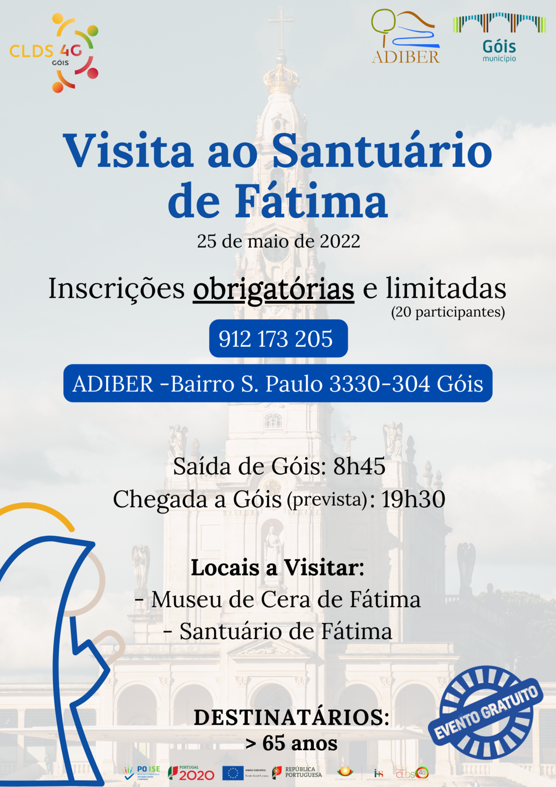 No próximo dia 25 de maio de 2022 a equipa do CLDS 4G Góis Solidário I+ irá promover uma Visita ao Santuário de Fátima, para a população idosa do Concelho de Góis.